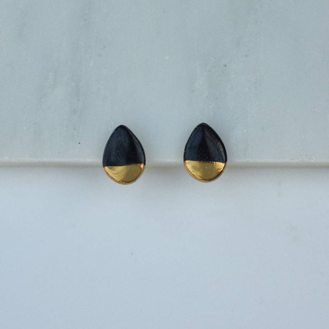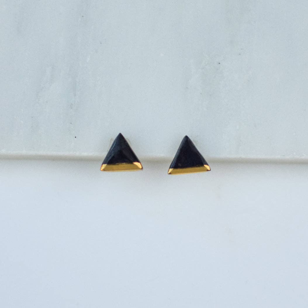 Black ceramic triangle shaped stud earrings with gold lustre and Sterling Silver Earring backs handmade by White Rain.