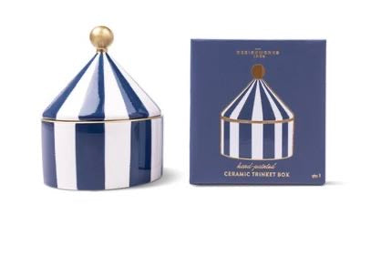 Add a little magic to a bedside table or dressing table with this hand-painted ceramic trinket box. Designed in a charming navy and white circus tent shape with glossy stripes and a sweet little gold knob on top, it’s the perfect place to keep rings, earrings, hair pins, or other tiny treasures safe.