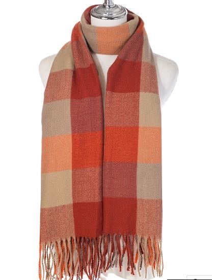 This Autumnal check scarf with soft hand feel is a gorgeous scarf for any outfit. This has a beautiful colour block in shades of orange to compliment any outfit and is perfect for Autumn/Winter.