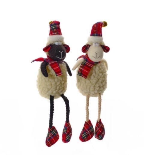 Welcome the baaa of our sheep into your stock this Christmas. Sheep shelf sitters made from white fleece fabric, featuring tartan hats, scarves, and shoes. Each sheep has long dangling legs and comes in different face colours. Designed with Christmas tartan patterns on accessories.