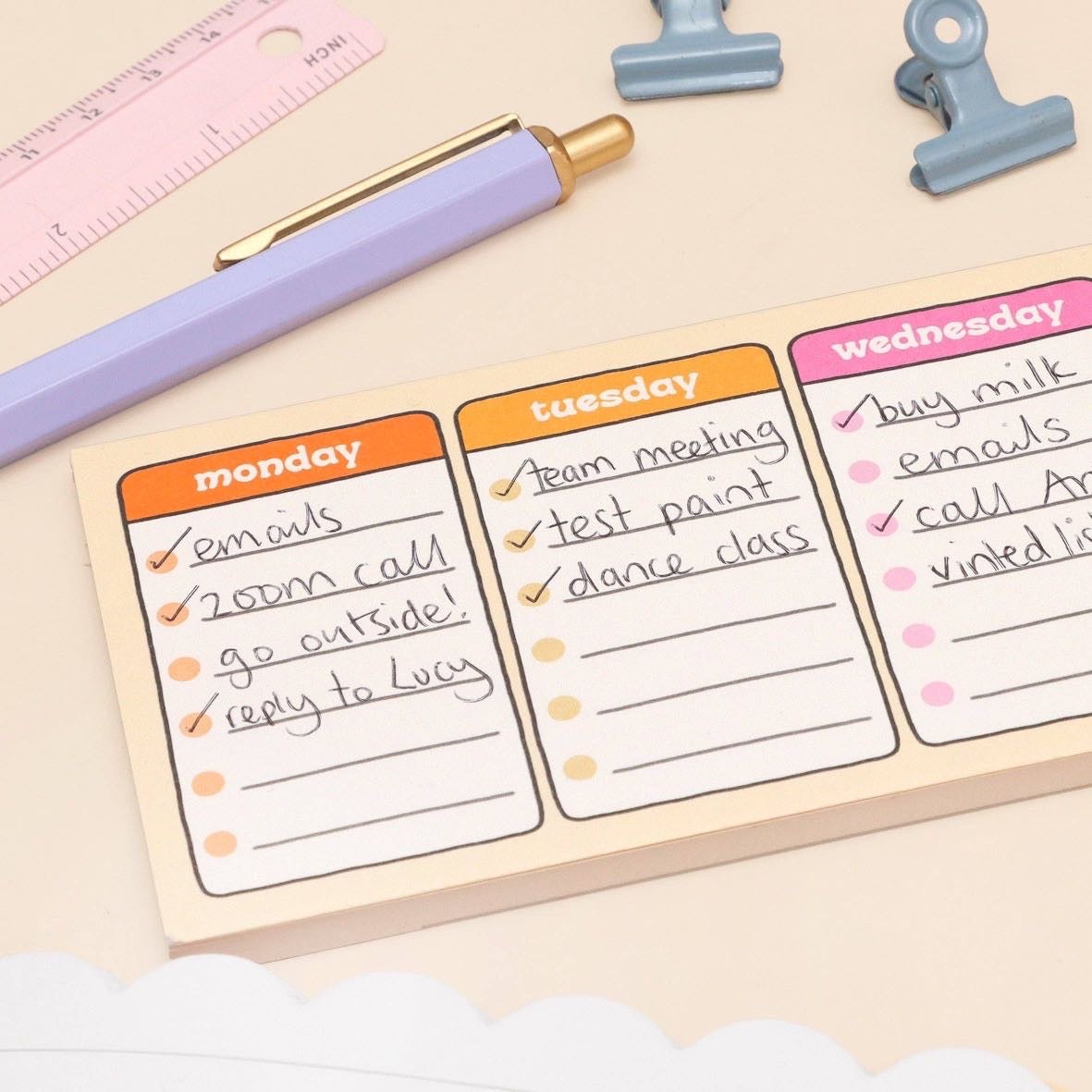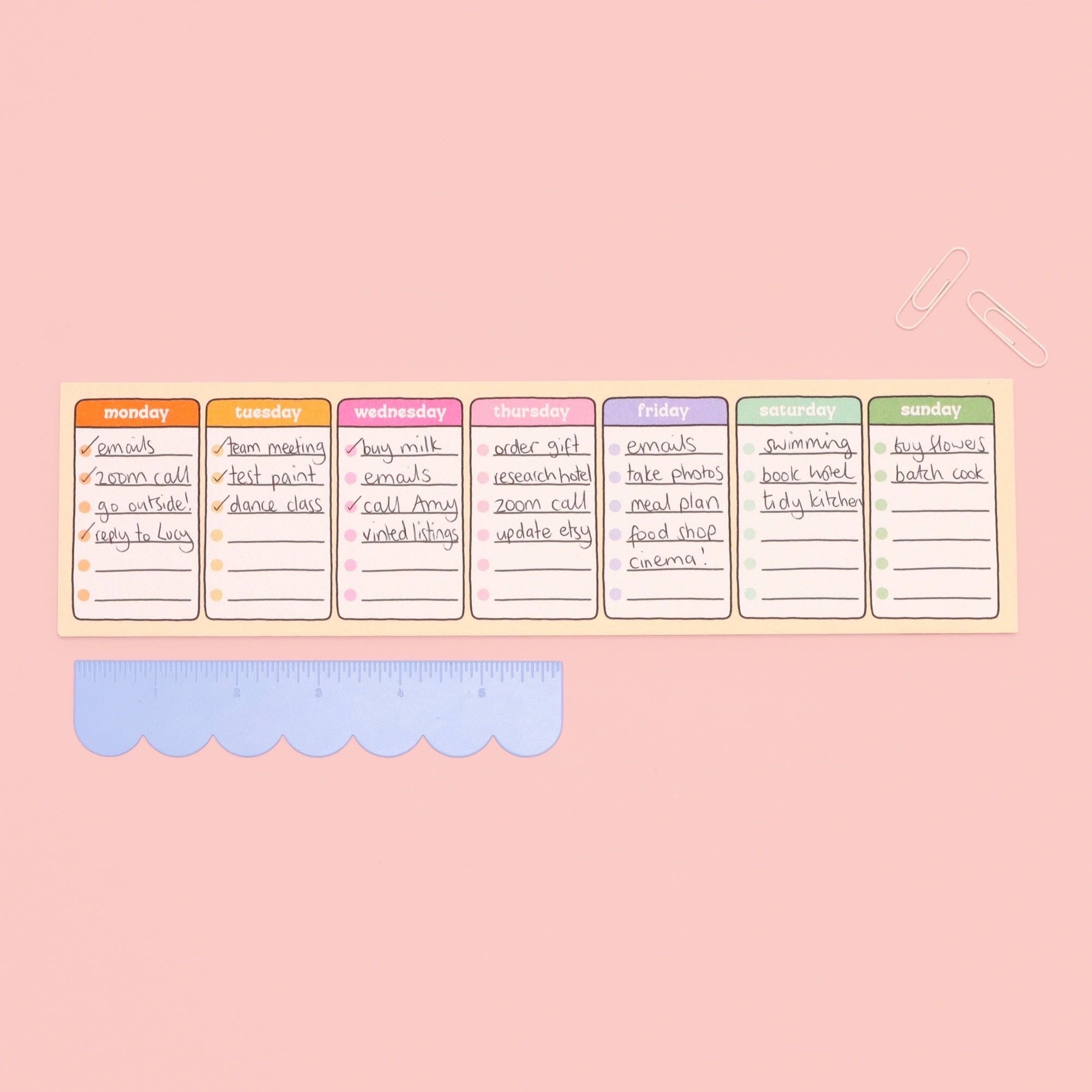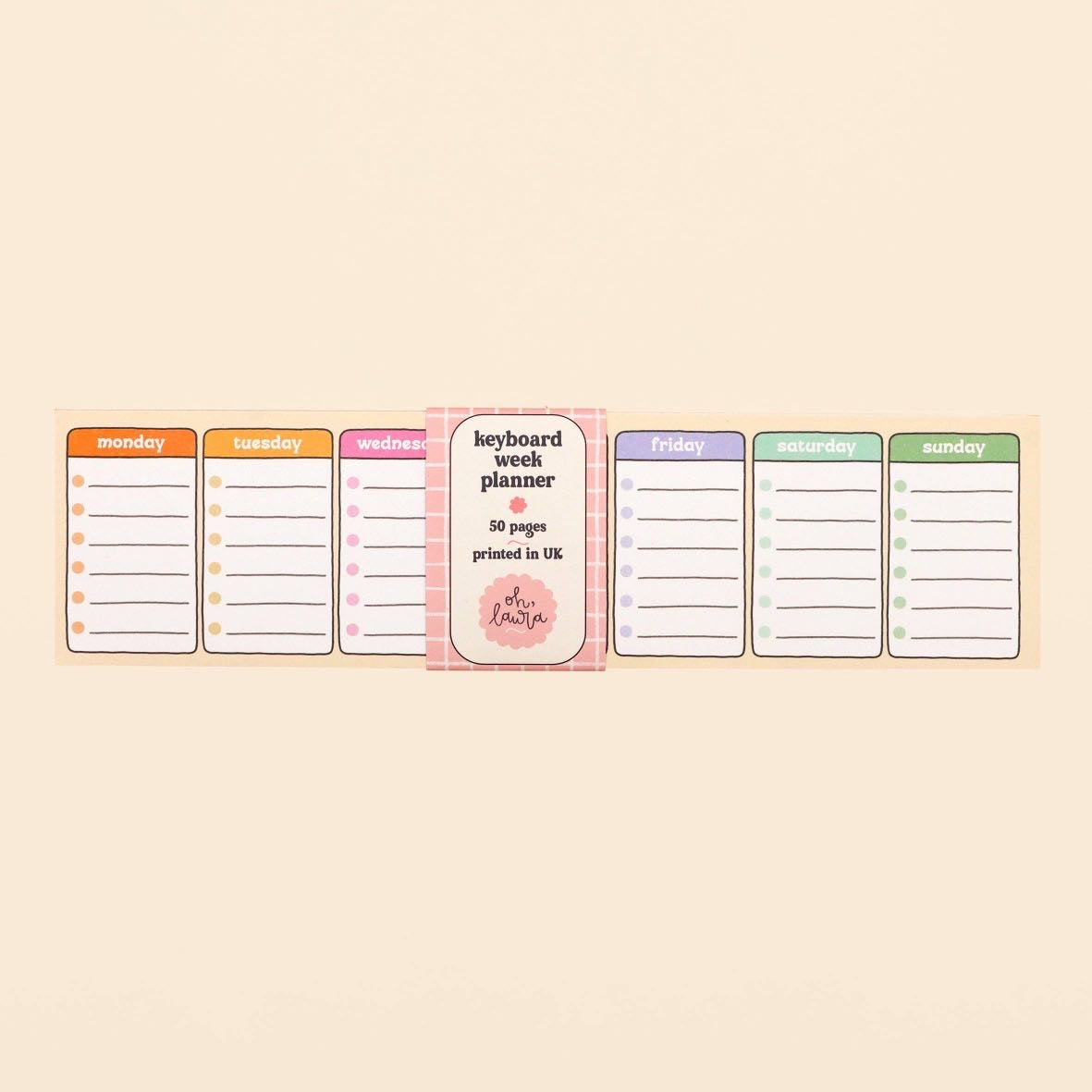 - Size: 80mm x 297mm (keyboard-sized perfection!) - 50 tear-off pages - Printed in the UK with an original Oh Laura design - Plastic-free packaging - Designed to keep your week in check without the overwhelm Great for: - Busy desks (and busy brains) - Simple weekly overviews.