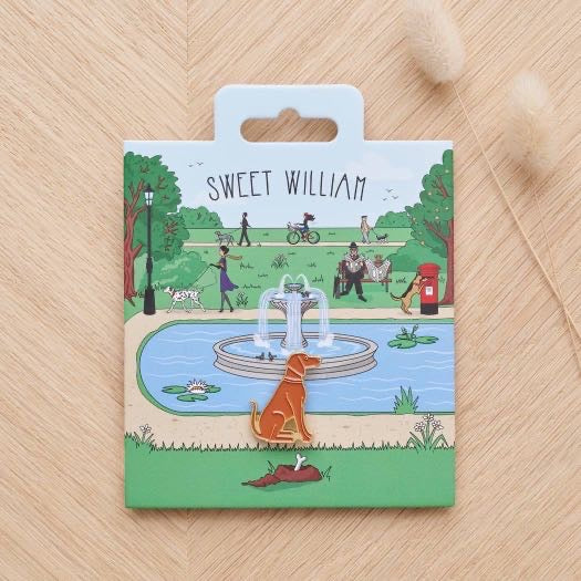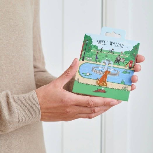 A beautiful, gold-plated enamel Vizsla dog pin presented on an adorable dog walker's backing card. To Ensure four legged friends are always kept near. Featuring a gold metal fastening for customers to attach the pin to their favourite coat, bag or scarf. The pin will arrive on a sturdy backing card depicting a typical dog walk in a scenic park. Perfect to send with a dog lover's birthday card or send alone as a thoughtful gift. Poem on the reverse of the card reads: Here's a little pin to brighten your day, pinned to you wherever you are, they never feel far away! We also have the dog pin available in other breeds as well.