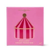 Add a little magic to a bedside table or dressing table with this hand-painted ceramic trinket box. Designed in a charming pink and red circus tent shape with glossy stripes and a sweet little gold knob on top, it’s the perfect place to keep rings, earrings, hair pins, or other tiny treasures safe.