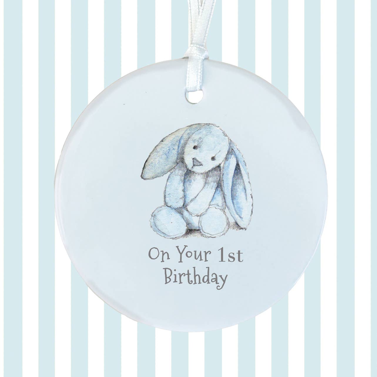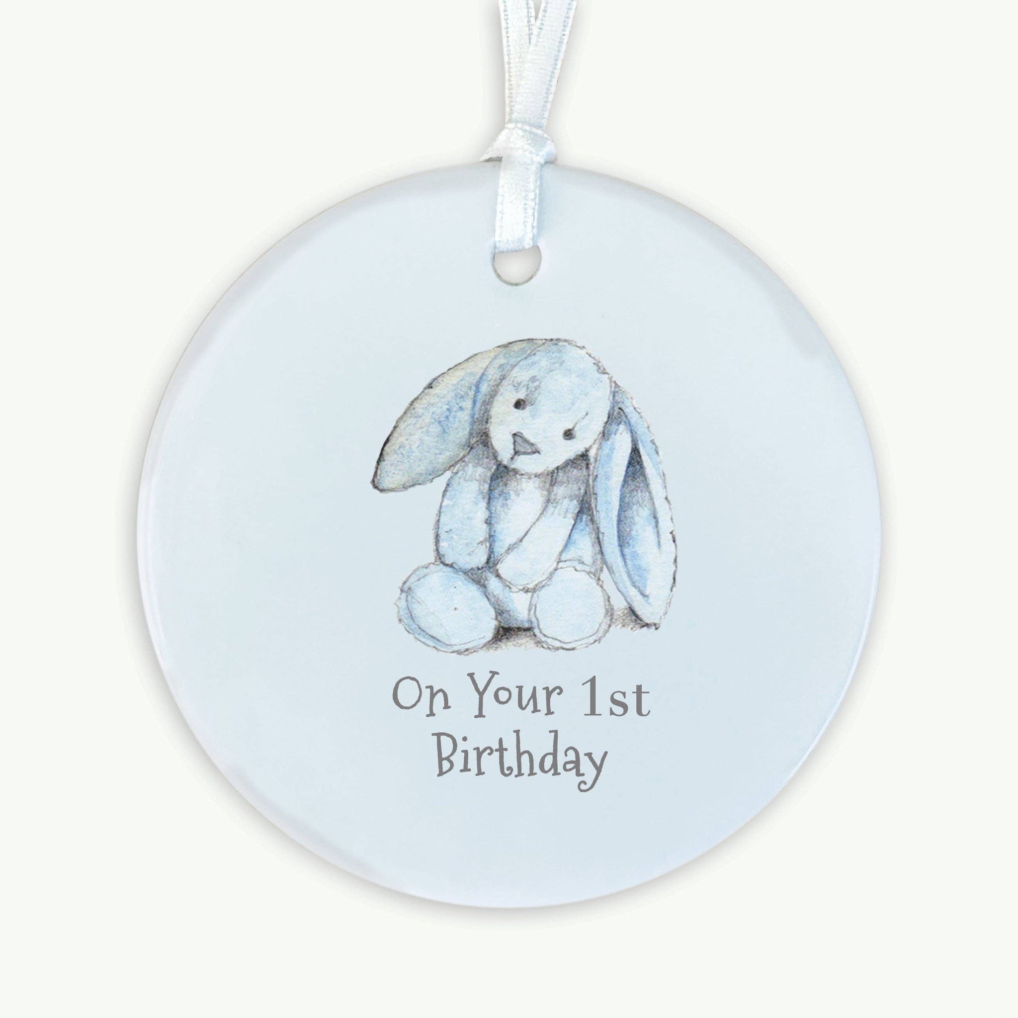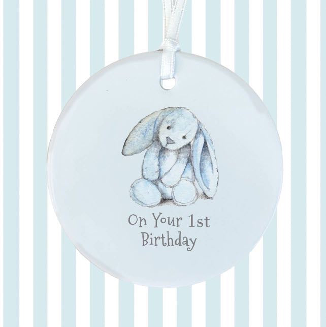 Celebrate a 1st Birthday for a special little boy with this cute rabbit hanging keepsake. Ceramic Ornament with Glossy finish Supplied with Satin Ribbon and a white Organza Drawstring bag.