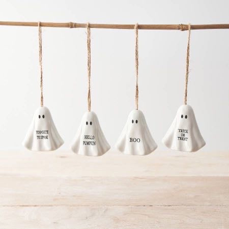 An adorable ghost ornament with a printed Hello Pumpkin slogan and jute string hanger. Perfect for Halloween decorations for around the home.