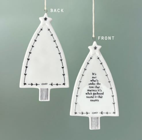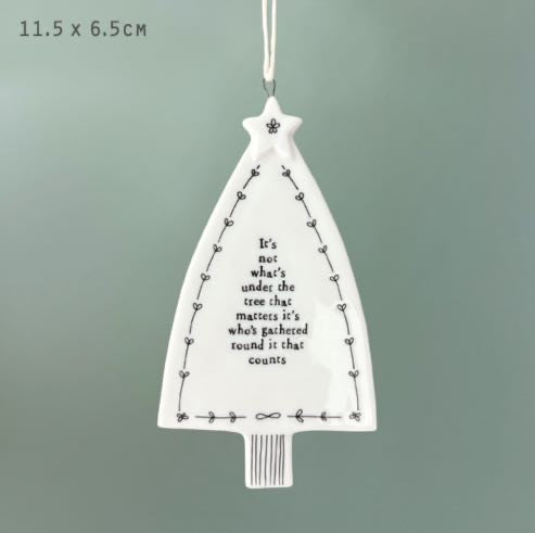 From the beautiful East of India range this beautiful ceramic hanging Christmas tree is a lovely gift for Christmas as a wee token with the sentimental words on the front of what Christmas means to you ‘It’s not whats under the tree that matters, it’s who’s gathered around it that counts’. An ideal Christmas gift for a loved ones tree this Christmas