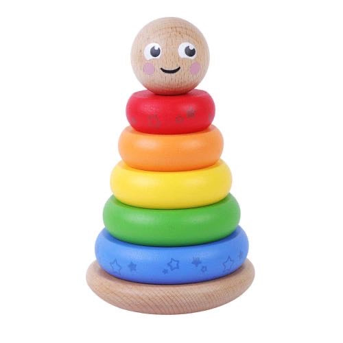 Happy and bright, this rainbow coloured wooden stacking toy is a timeless classic. The five stacking rings can be threaded on to the central peg and then topped with the gorgeous smiling spherical face. Wobbly base for even more fun. Carefully designed with elastic attachment of the pole for safety. This simple toy is a great one for encouraging hand eye coordination. Well made from ethically sourced products and manufacturers. Makes a fabulous first birthday gift or Christmas present.