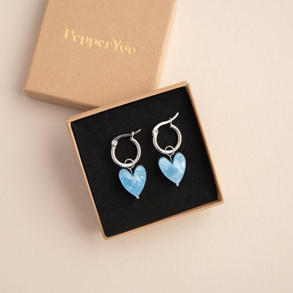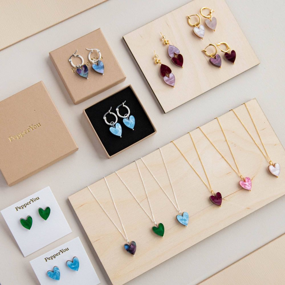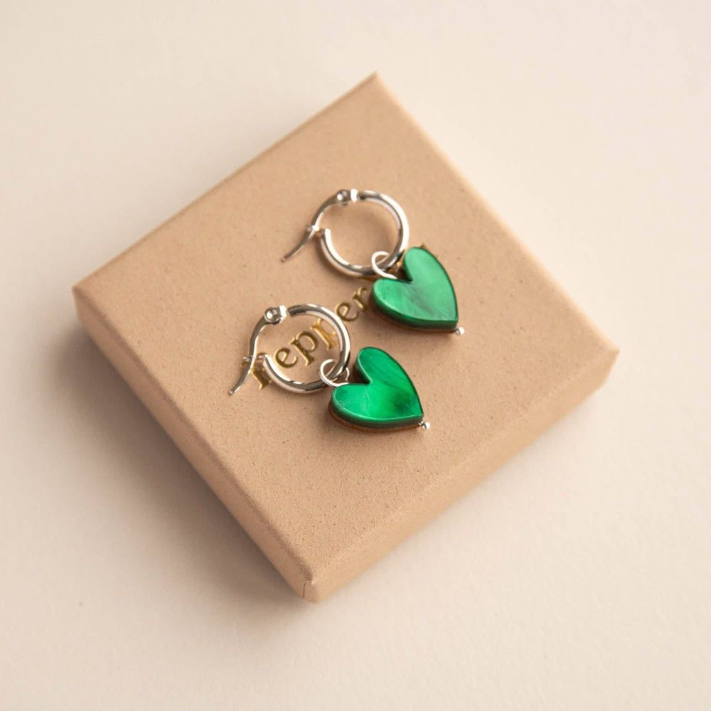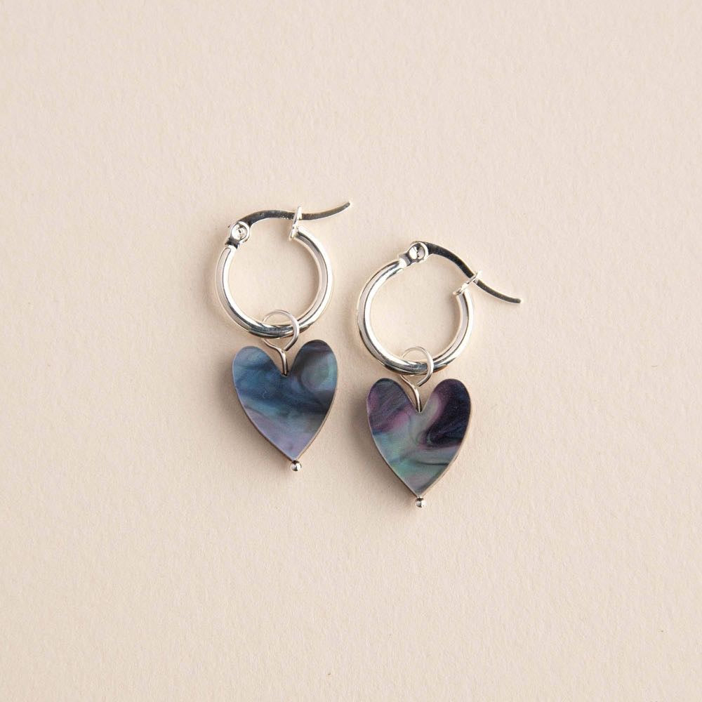 Whether you're celebrating a friend, a partner, yourself or a family member, these earrings are a thoughtful way to share the love. Designed and hand crafted by our small team, these earrings are lightweight and created with all-day lightweight comfort in mind. Hand crafted with acrylic and FSC certified wood with silver colour steel earring hoops . Available in three marble shades – Emerald Green, Ocean Blue or Mermaid Mix – you can choose a matching pair or mix and match for a unique look.
