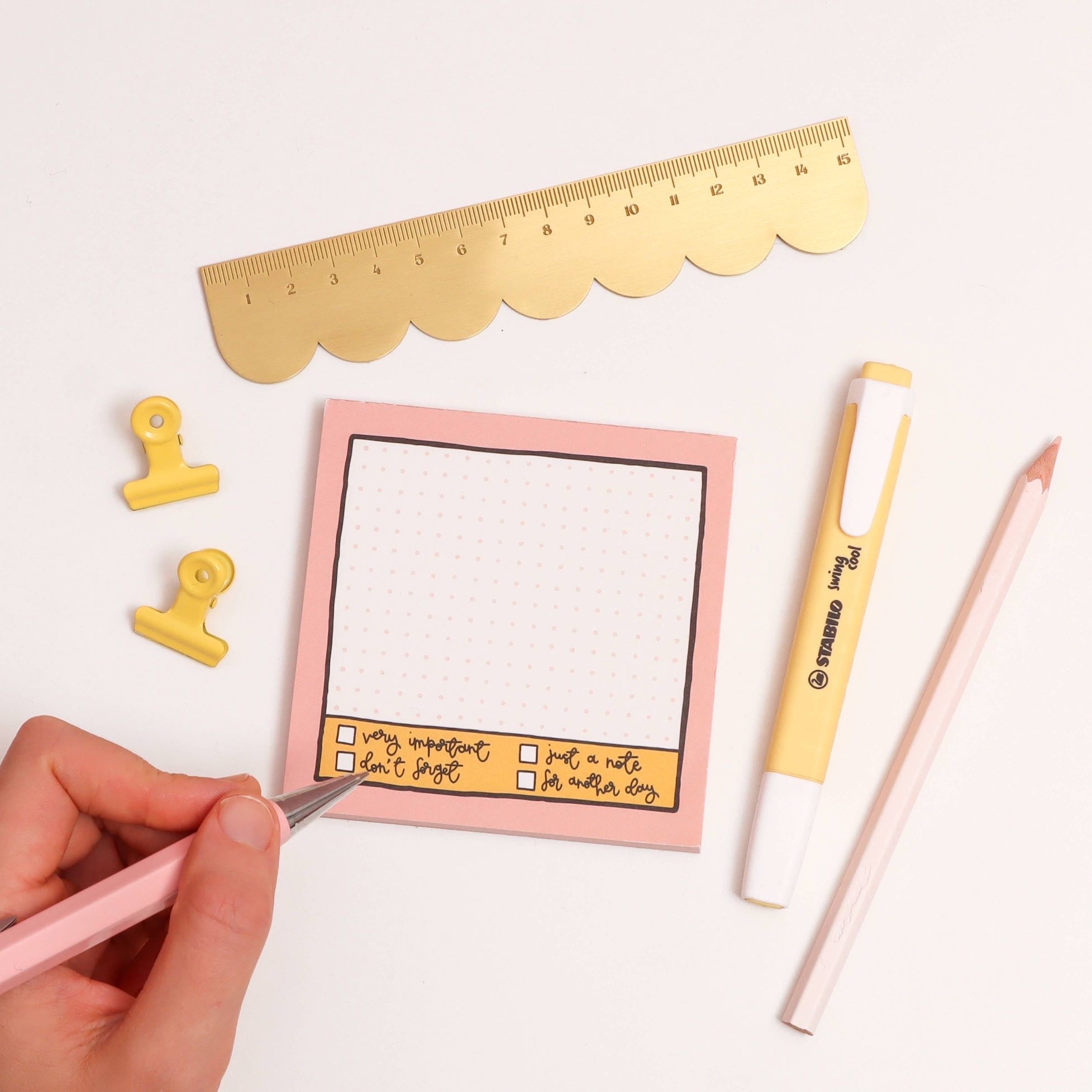 - 50 tearaway pages - 100gsm professionally printed bright white paper - Thick board backing - Packaged with a branded paper belly band - Measures 93x93mm - Perfect for jotting down important dates, tasks and notes.