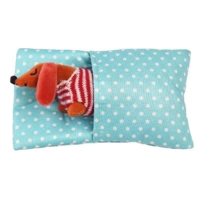 A cute miniature soft toy of a sausage dog wearing a striped jumper. Comes with a polka dot blanket, tucked up inside an illustrated gift box. Care guidance: • Hand wash only