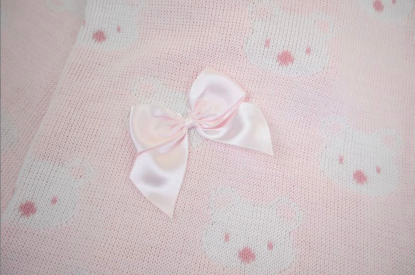 Beautiful pale pink shawl with a cute little bear faces and a natural satin bow in one corner.