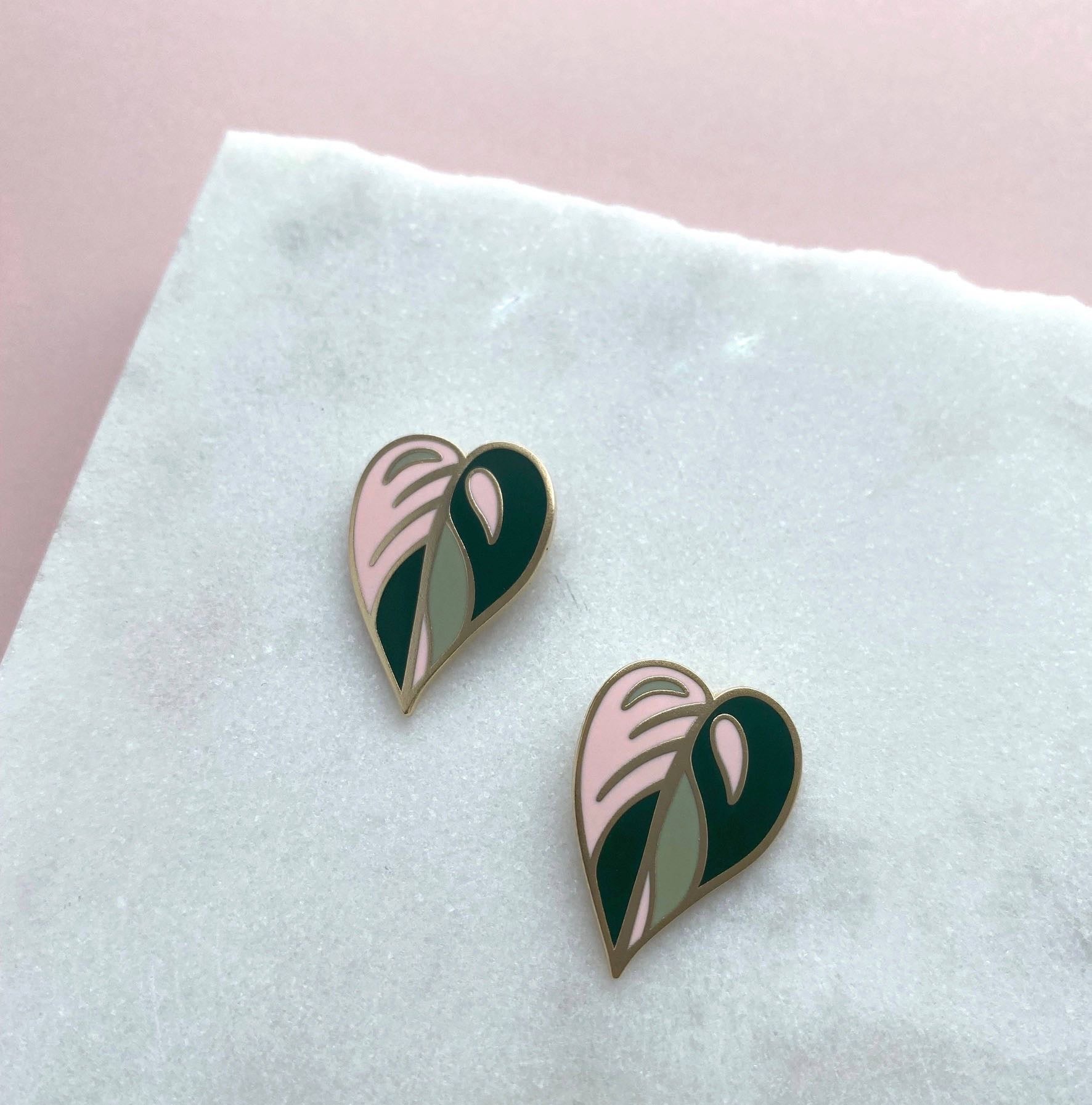 Pink princess philodendron leaf stud earrings These lightweight earrings measure 2.5cm with gold plated earring posts. Made from hard enamel and gold plated brass. All metal findings are nickel free and hypoallergenic Looking for the perfect botanical earrings then look now further. Stunning gift for a loved one or a treat for yourself.