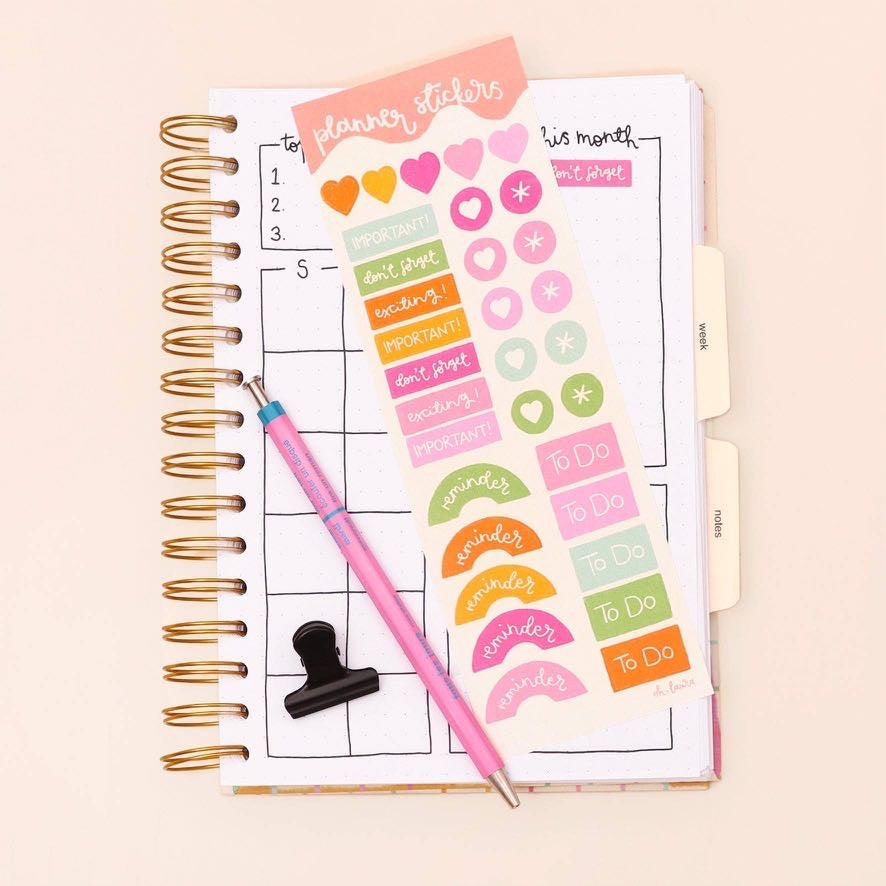 Brighten up your notebook or daily planner with stickers for tracking goals, tasks, and reminders. These planner stickers bring structure and colour to your bullet journal, making organisation fun! Featuring stickers like hearts, stars, reminders, to-dos and more. This sticker sheet measures 185mm x 72mm, and features 32 individual stickers, perfect for bullet journals, planners or decorating all your surfaces. Made from a high quality matt vinyl and specialist inks, printed in the UK. To write on the stickers, we recommend using a standard biro.