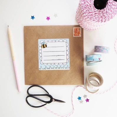 Every card comes with a kraft brown envelope which has an illustrated address sticker attached and are individually wrapped in a biodegradable cellophane bag.