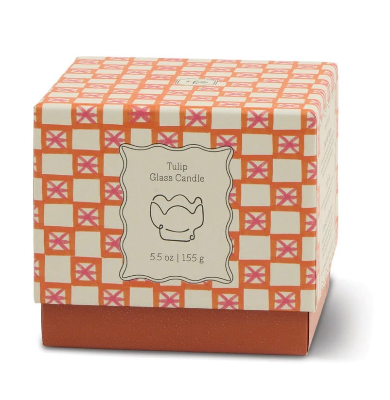 Just bloomed! These Tulip-inspired shaped glass candles are filled with fragrances inspired by springtime flowers and gardens. Glass candles are packaged in sliding boxes which feature illustrated patterns to coordinate with each bud. You can purchase an accompanying fragranced glass tulip in an adorable tin candle to match.