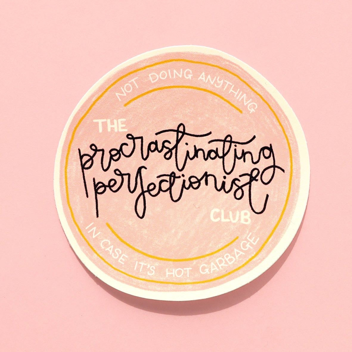 Welcome to the club you didn’t ask to join but definitely belong to. This tongue-in-cheek sticker celebrates the paradox of perfectionism and procrastination. Great for planners, notebooks, or anywhere that reminds you to laugh at your own chaos. Approx. 70mm x 70mm Glossy vinyl, waterproof & weatherproof Professionally printed in the UK.